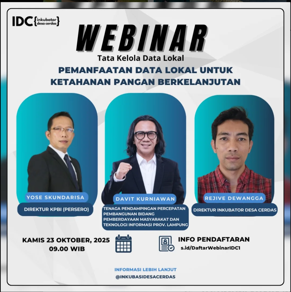 Dalam rangka Percepatan Integrasi Data dalam mendukung program 100 Hari Kerja Gubernur Lampung Inkubator Desa Cerdas mengadakan webinar dengan tema : “Study Case APBDes Pembiayaan SIPDEskel hingga implementasi sipdeskel serta Visitasi dalam melakukan Padanan dan pemutakhiran data Desa” Tanggal: Selasa, 25 Maret 2025 Waktu: 10.00 WIB – selesai Pembicara: – Bro Sugeng (Kacab. IDC Lampung […]